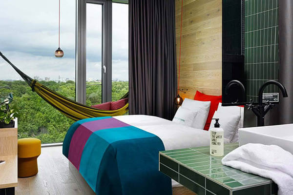 Beach-Feeling im Hotel. Dieses Hotel vereint Großstadt mit Tropen. Benannt nach dem denkmalgeschützten Bikini-Bau, findest du hier eine Hängematten-Lounge, eine hauseigene Bäckerei und eine Menge Pflanzen. Von den Gästezimmern aus kannst du die Gedächtniskirche bestaunen, die in Kombination mit dem Hotel die wüste Kreativszene Berlins widerspiegelt.