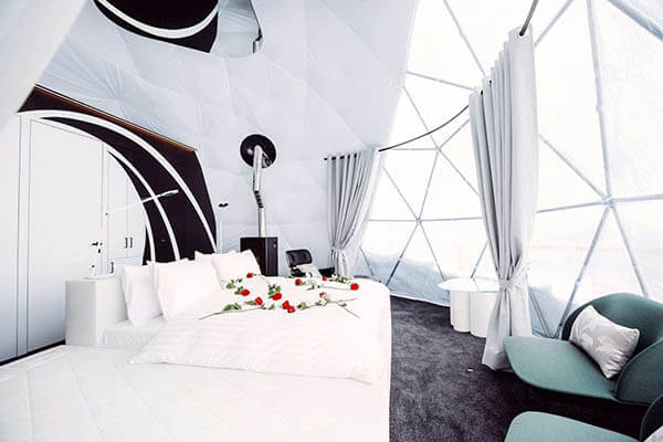 Bei den Hotelzimmern handelt es sich um geodätische Pods inmitten der Natur. Diese wurden nur mit dem notwendigsten Material gebaut und sind enorm energieeffizient. Recycling von Energie, Wasser und Abfall findet man hier ebenfalls vor.